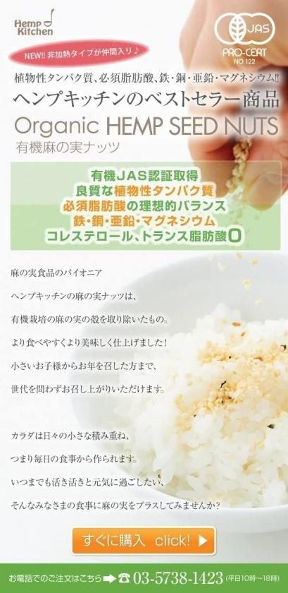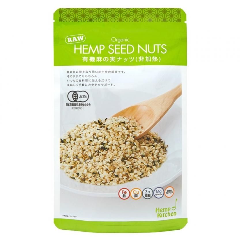サラダに入れたり、そのまま食べてもおいしいです。上品な味で、クルミやアーモンドのような香りです。 Hempkitchen社の商品説明 ヘンプキッチンの定番商品、麻の実ナッツ(ヘンプシードナッツ)。 当社ではカナダ産有機栽培の麻の実のみを使用。 麻の実の有機認証取得は当社が初です。 麻の実ナッツは、麻の実の殻を取り除いた中身の部分。封を開けてそのままお使いいただけます。 ごはんやサラダ、和え物にかけたり混ぜたり。アイスやヨーグルトにトッピングしても。 クルミにも似たコクで柔らかく、お子様からお年を召した方までお召し上がりいただけます。 中国において麻の実は「火麻(ひま)」と呼ばれ、長寿村として有名な巴馬地区では、 麻の実をを常食していることが長寿の秘訣だと言われています。 麻の実ナッツは消化吸収のよい良質な植物性たんぱく質、必須脂肪酸を大変バランスよく含んでいます。 さらに現代の食生活に不足しがちな鉄・銅・亜鉛・マグネシウムが豊富。美容食としてもオススメです☆ ※直射日光および高温多湿を避け、冷暗所で保存。開封後は冷蔵保存で、約2ヶ月程でお使い下さい。